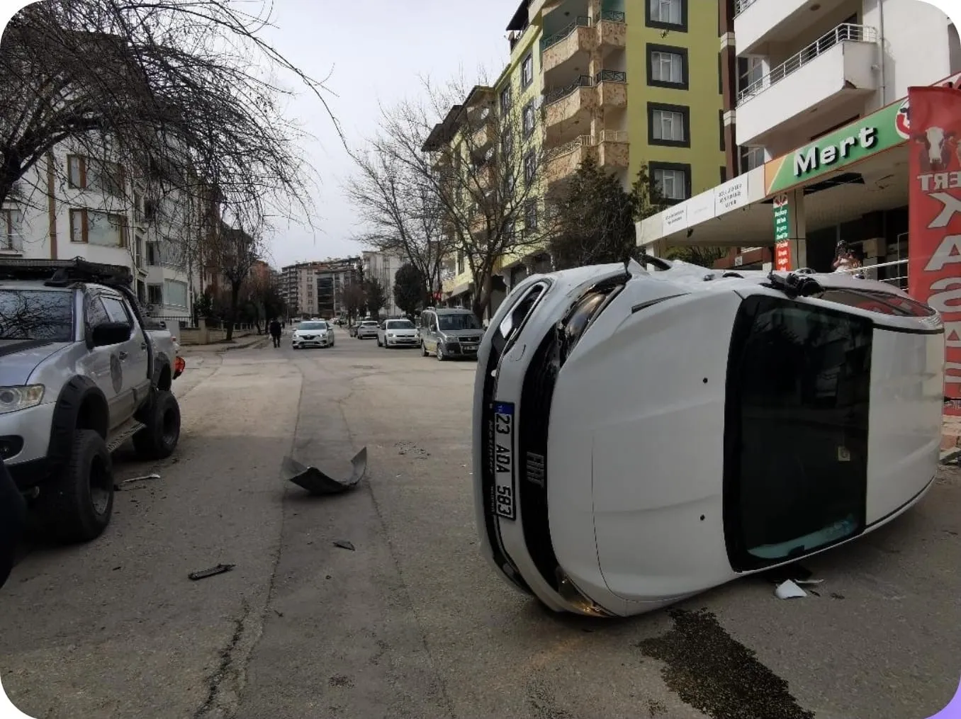Elazığ’da park halindeki araca çarpan otomobil devrildi.