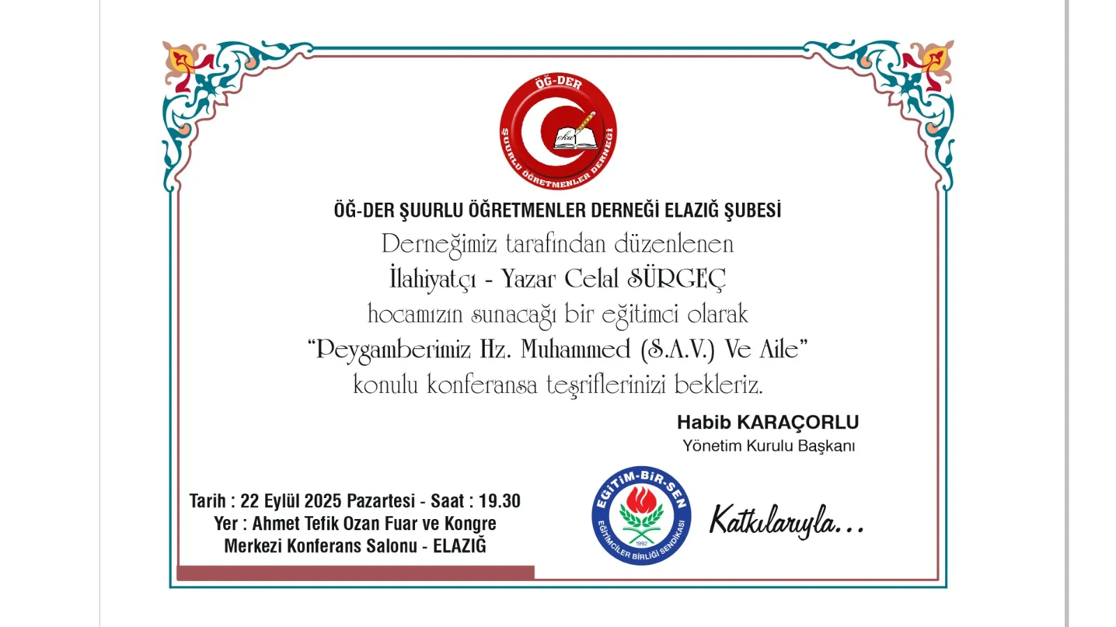Şuurlu Öğretmenler Derneği tarafından her yıl Mevlid-i Nebi Haftası kapsamında düzenlenen konferanslardan biri bu yıl da gerçekleştirilecek.