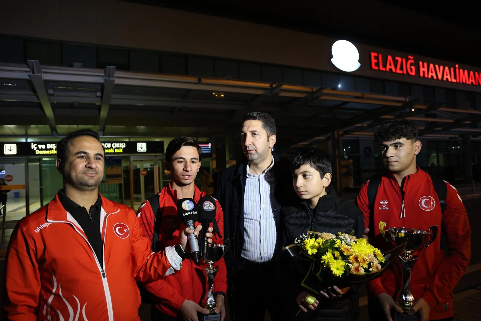 Slovakya’daki büyük zaferin ardından milli sporcularımızı taşıyan uçak Elazığ’a iniş yaptığında, Elazığ Gençlik ve Spor İl Müdürü Abdulsamet Eren, Elazığ Gençlik Spor Kulübü Başkanı Alaattin Özdemir, Gençlik ve Spor ailesi, antrenörler, sporcu arkadaşları ve sporcuların aileleri havalimanında hazır bulundu.
